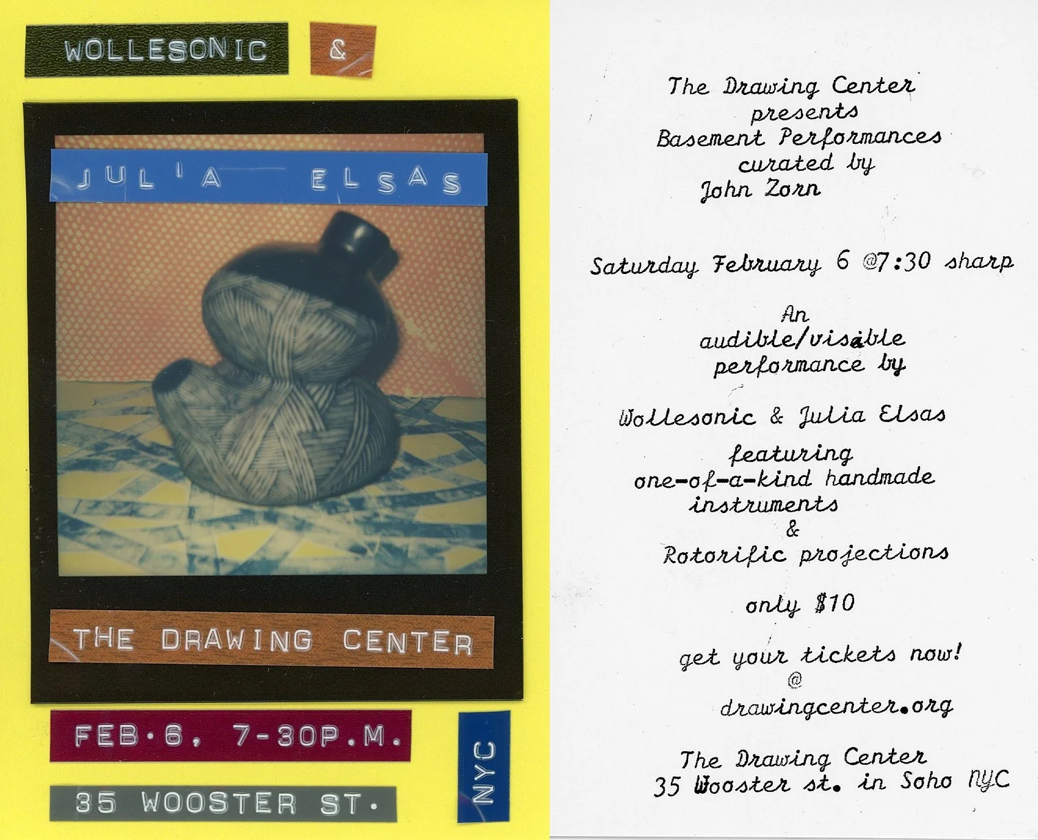 Kenny Wollesen and I will perform on February 6, 2016 at The Drawing Center. Our sonic and visual performance is a part of The Drawing Center's Basement Performanceswhich is curated by renowned composer and performer John Zorn. Other musicians and artists participating in two month series include: Okkyung Lee and Andrew Lampert; Raha Raissnia and Panagiotis Mavridis; Bill Laswell; Kenny Wollesen and Julia Elsas; Ela Troyano and Uzi Parnes; and Ikue Mori.